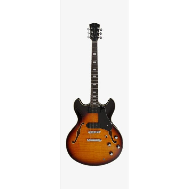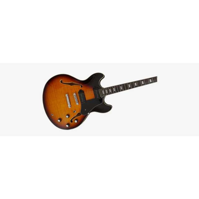 La Sire H7V tiene un cuerpo semi-hueco de arce laminado de doble Cutaway y con un diapasón de ébano.