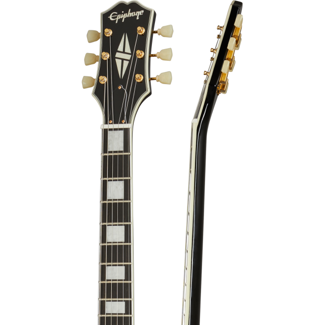 La Epiphone SG Custom presenta un cuerpo de caoba, un diapasón de ébano con incrustaciones del estilo de la LP Custom, Hardware dorado y pastillas humbucker Alnico Classic Pro.