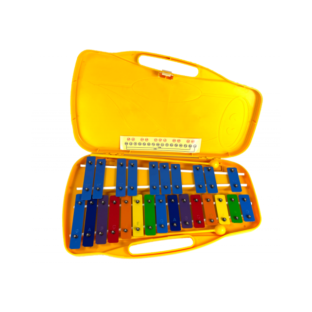Carrillón de 25 láminas cromáticas multicolores. Notas G5-G7, que incluye 2 mazas y estuche de plástico con asa.