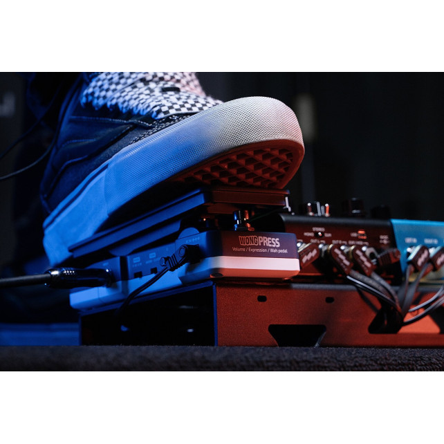En colaboración con Cory Wong, este Wong Press es un pedal 4 en 1 con las especificaciones personales de Cory: Icónica combinación de colores azul y blanco, curva de control de volumen personalizada, rango Q de wah afinado y una tira de LED STATUS de dos colores que indica simultáneamente el modo actual y la posición del pedal.